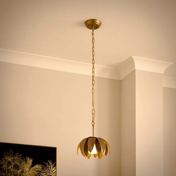 Ideal for making a statement, the Alder Art Deco Adjustable Pendant Light boasts a beautiful, sculptured leaf design in a soft, gold colourway. The chain and fabric flex add an eye-catching vintage quality.