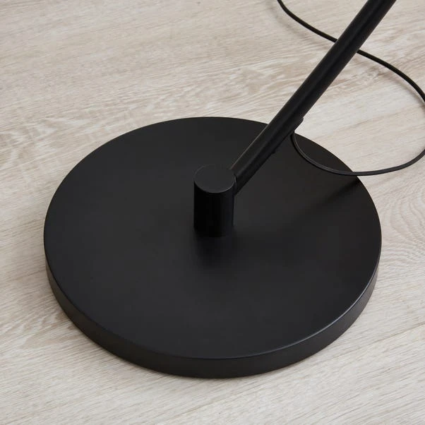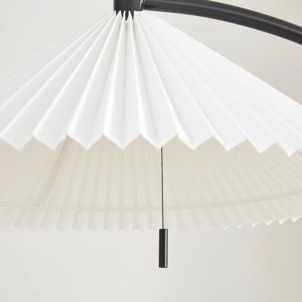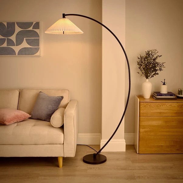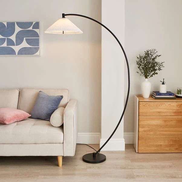 This floor lamp boasts a very unique design with an arched silhouette, a sleek matt black metal frame, and a white lamp shade. It’s an eye-catching addition to any home.