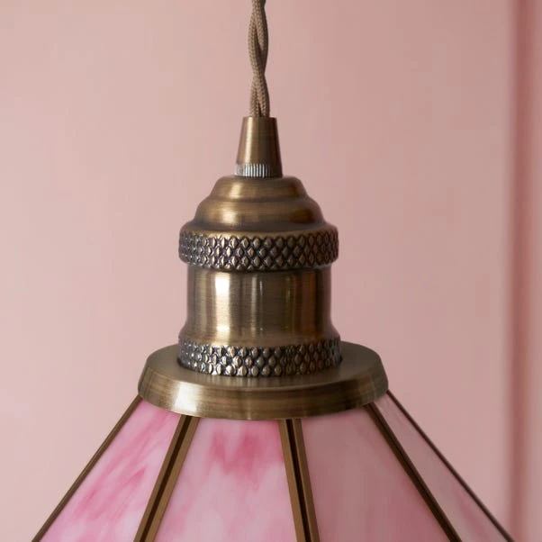 Both elegant and beautiful in design, the Colette Mid Century Adjustable Ceiling Light is guaranteed to make a statement in your living space. It features a tiffany-style scalloped shade, with brass-framed marbled panel glass.