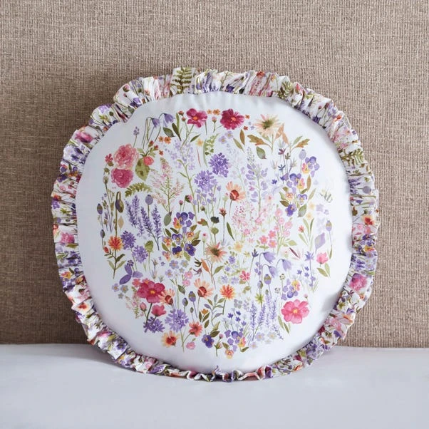 Bring the beauty of countryside flower meadows into your home with our colorful floral print round cushion, featuring a ruffle edge and crafted from luxurious 100% cotton sateen with a 300 thread count. Complete your decor with coordinating curtains, bedding, pillow shams, sheets, bedspread, and bolster pillowcase for a harmonious look.
