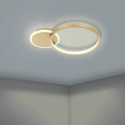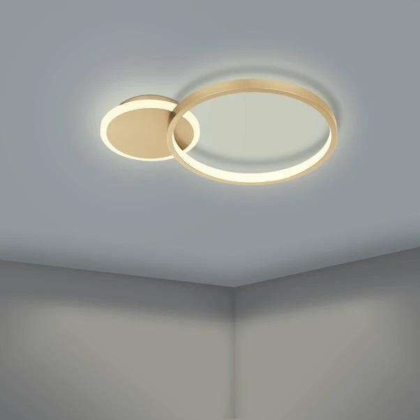 The Gafares LED ceiling light features a metal base in a choice of gold and white, a round light panel fitted with a ring-shaped LED profile and an inner light diffuser. The integrated LEDs under the white plastic light diffuser produce an adjustable light with a choice between warm white, neutral white and cool white light. The product includes a remote control, which offers features; such as dimming, a nightlight and a timer (switch off after 30 minutes). With its minimalist design, the product provides modern lighting for any space, whether in the kitchen, living room, bedroom, hallway or dining room.