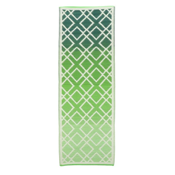The Fallen Fruits Floating Pattern Balcony Runner is an easy-to-clean, water-permeable rug with a reversible design. Featuring a geometric pattern in an ombre green colour, it adds a touch of style to your balcony or patio while offering practicality for outdoor use.