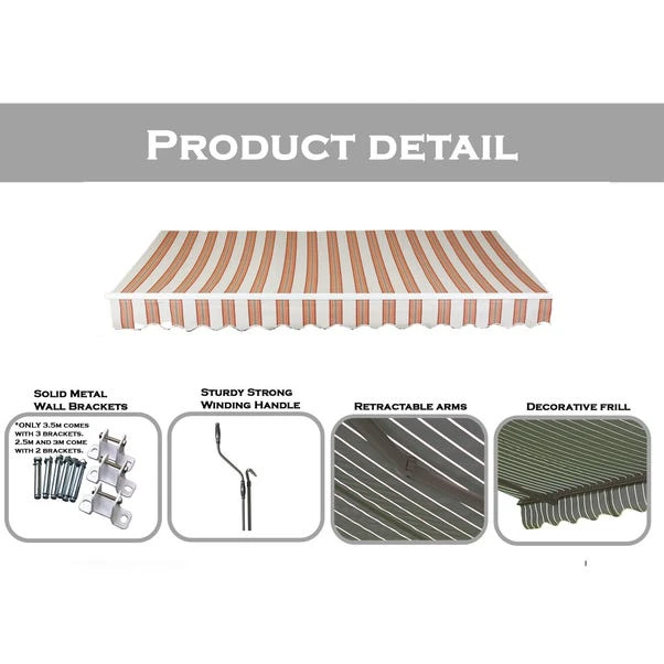 Providing shade and comfort for outdoor areas, this awning is a practical and stylish solution for patios, balconies, and decking spaces. The durable 280gsm polyester fabric ensures reliable protection from the sun and light rain, making it a versatile addition to any garden setting. The winch mechanism allows for effortless extension and retraction, giving you full control over your shaded space. Installation is simple, with easy-to-follow instructions included, and the awning can be detached from its brackets when not in use for secure storage.