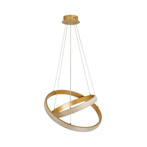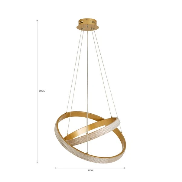 Add a glamorous touch to your home with the Hotel Harrogate 2 Light Ceiling Light. Featuring a suspended dual gold hoop with dual lit crystal effect LED integrated within the light, finished with a striking gold base and a height adjustable silver cable. The Hotel Harrogate Ceiling Light is the perfect piece to add a luxurious feel to your interior, pair with available matching family items to complete the look.