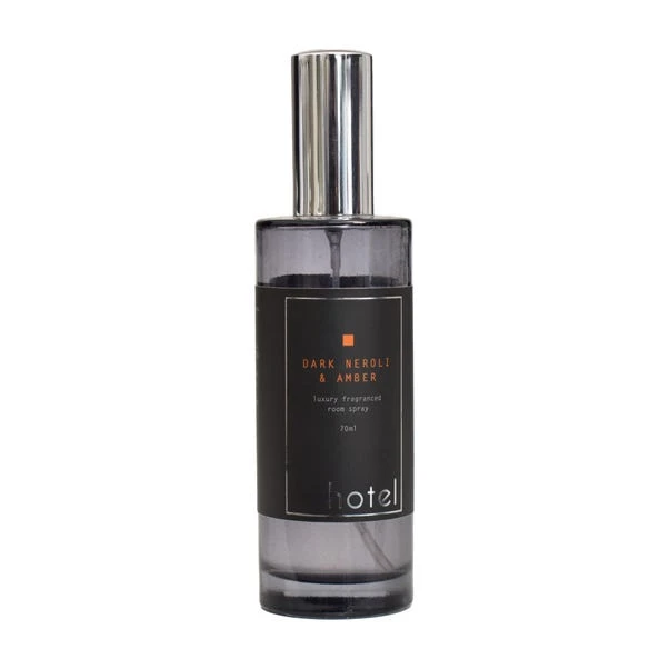 A woody combination of neroli and patchouli, leads into a sensuous blend of amber, sandalwood and sweet spices. This room spray is encased within a translucent black glass vessel with matte silver trims.