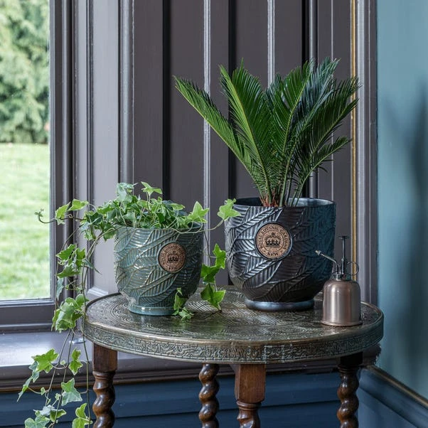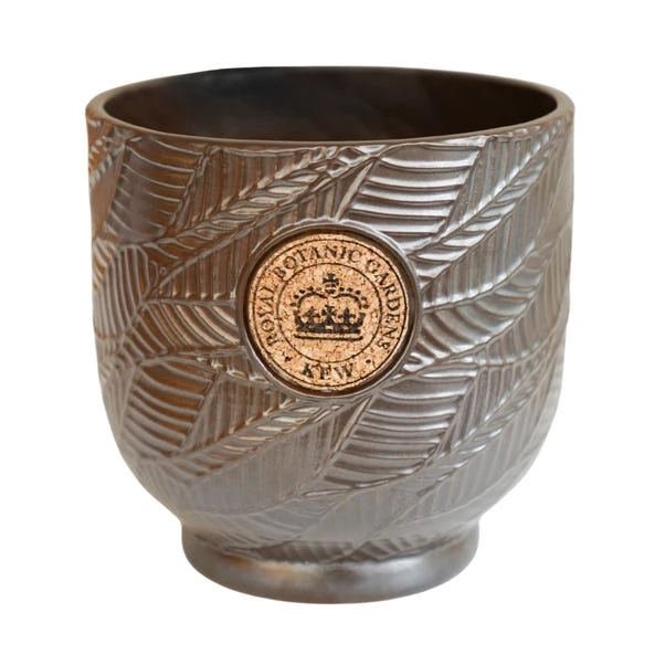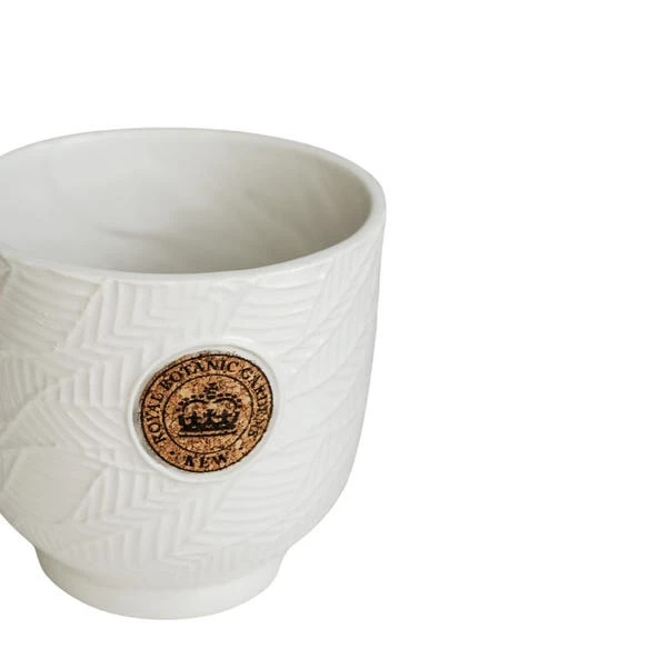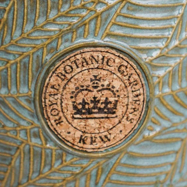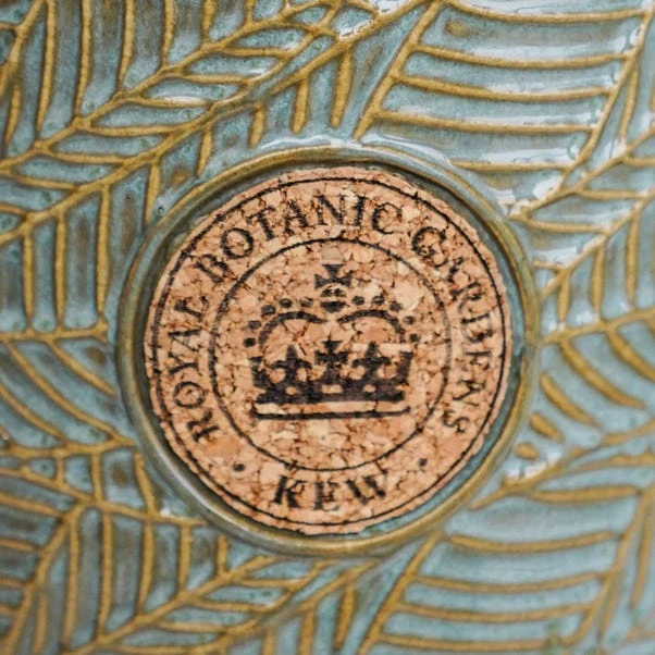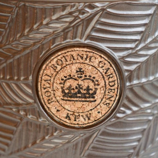 Enhance your indoor garden with the Kew Leaf Embossed Ivory Cork Planter, available in a range of sizes and colours. Its elegant leaf pattern and cork Kew logo are finished with a stunning reactive glaze, offering a sophisticated and versatile option for plant lovers.