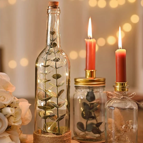 Create a romantic and cosy glow with this bottle style candle holder from Love Story. Suitable for taper candles, this holder features blush coloured decoration inside a sleek glass bottle with matching bow. The perfect way to add an eye-catching centrepiece to your table.