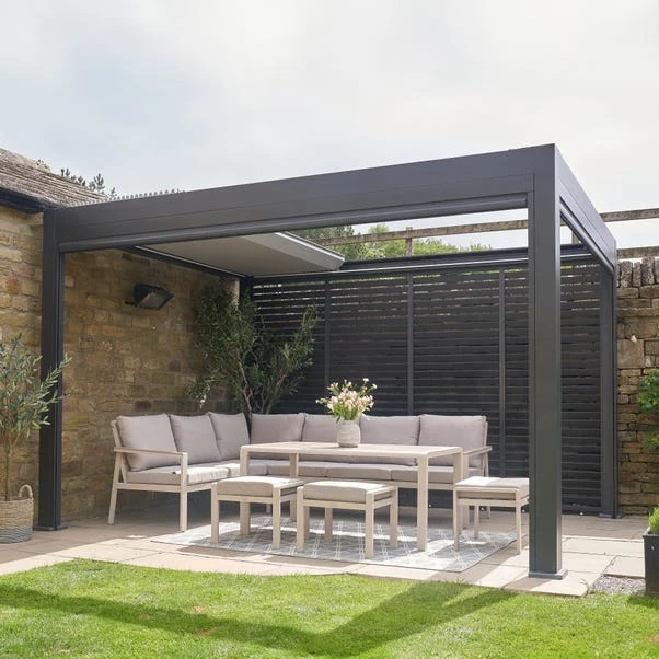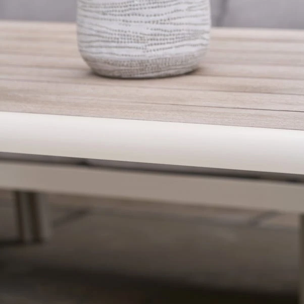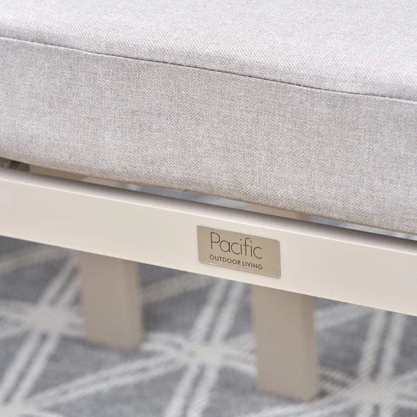 Upgrade your outdoor space with the Aruba Outdoor Corner Seating Set, designed for ultimate comfort and style. The set includes 1 Left Arm Sofa, 1 Right Arm Sofa, 1 Coffee Table, and 3 Footstools, all crafted with a powder-coated aluminium frame. The season-proof cushions are made from Putty Olefin fabric, ensuring durability and comfort. The Ash wood-effect glass coffee table adds sophistication to the collection. Use an Aerocover for added protection, and enjoy the 3-Year Structural Guarantee.