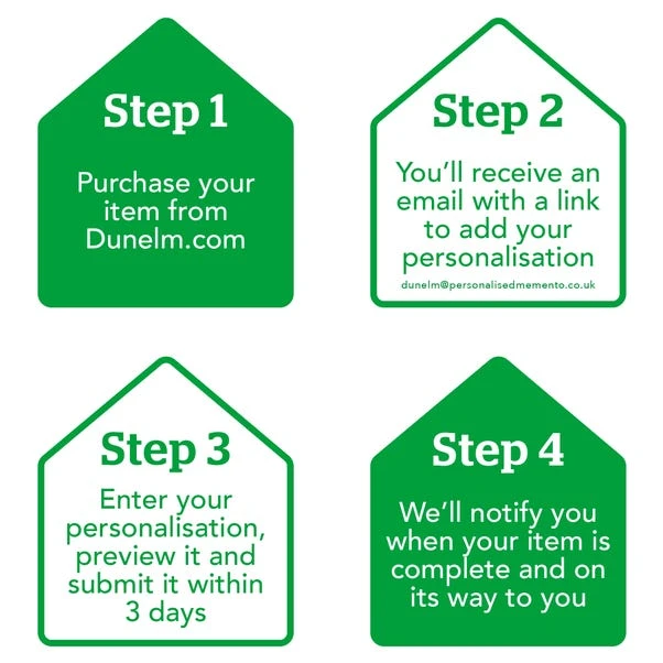 By ordering a personalised product, you are agreeing that your details (name and contact details, including address) and the details that you provide of any other party, such as the recipient of the personalised product, can be shared with our third party supplier who provides the personalisation service only for the purposes of completing the personalisation service and delivering the product to you or the recipient. Our Privacy Policy is here: Privacy Policy | Dunelm.