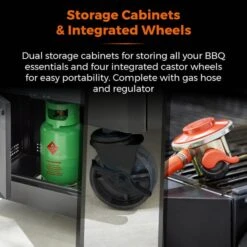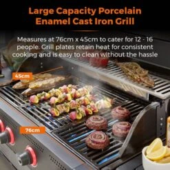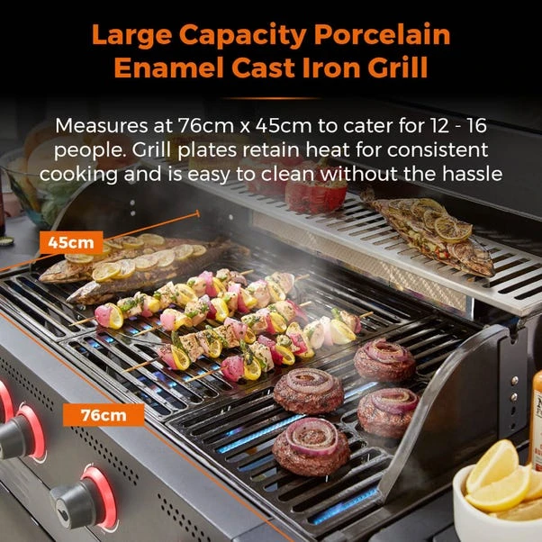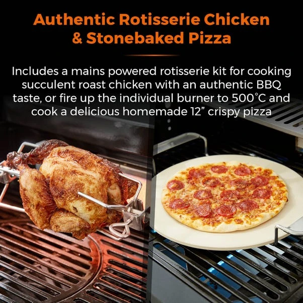 The porcelain enamel coated cast iron grill and precision heat thermometer ensure that you get perfectly cooked food every time, while the glass window lid lets you keep an eye on things without losing any heat. And with six burners, a rear back burner, and a multi-function side burner, you’ll have all the cooking space you need to whip up a feast for your friends and family. The included rotisserie and cover, removable pizza stone, and removable fat collector tray make this BBQ incredibly versatile and easy to clean. And with four caster wheels with brakes, you can easily move it around your patio or backyard.