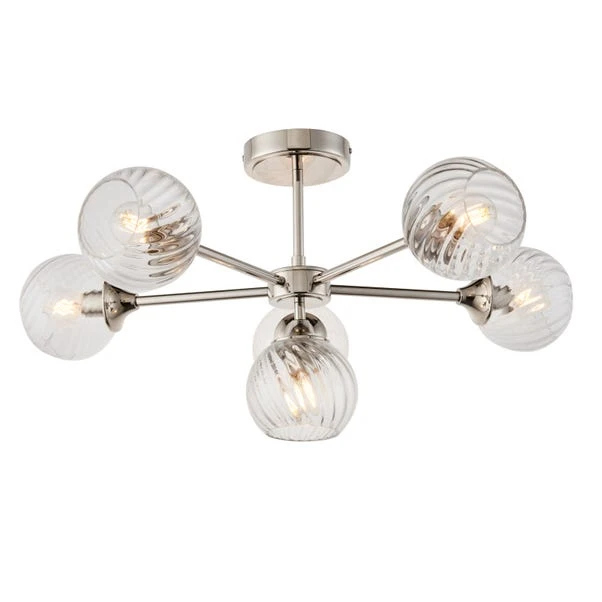 Make a statement with Vogue Lighting’s Asher Art Deco 6 Light Semi Flush Ceiling Light. With bright, nickel-plated metalwork and clear, spiral patterned glass shades, it’s the perfect eye-catching addition to your home.