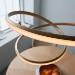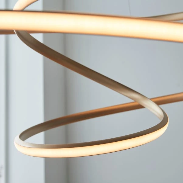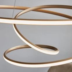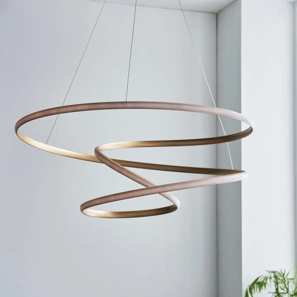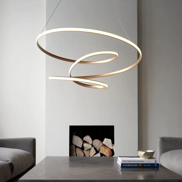 Add a touch of contemporary elegance to your space with our Tristan Small 1 light pendant, a lighting solution that effortlessly blends style and function. Featuring a captivating gold finish in a swirling design, this pendant light brings a modern and calming aesthetic to your interior. The integrated LED light ensures efficient illumination, while the dimmable feature, compatible with a dimmer switch, allows you to tailor the lighting to create the perfect ambience. Designed with versatility in mind, this pendant light is available in a large size and can be easily adjusted to different heights using delicate cables, creating a floating effect.