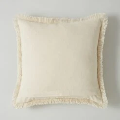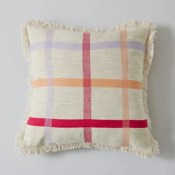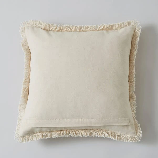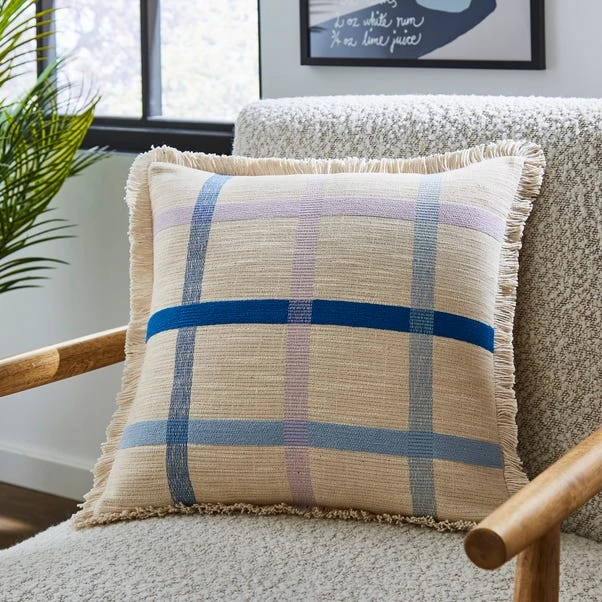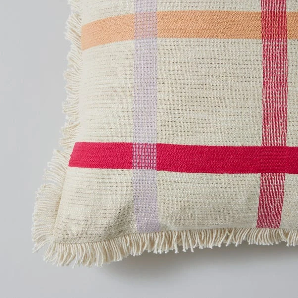 Add a touch of modern sophistication to you home with this beautiful check cushion. Comprised of 100% cotton with a slub effect, this cushion boasts a large embroidered check pattern with a playful fringe around the edge creating a sense of luxuriousness whilst evoking a sense of modernism at the same time.